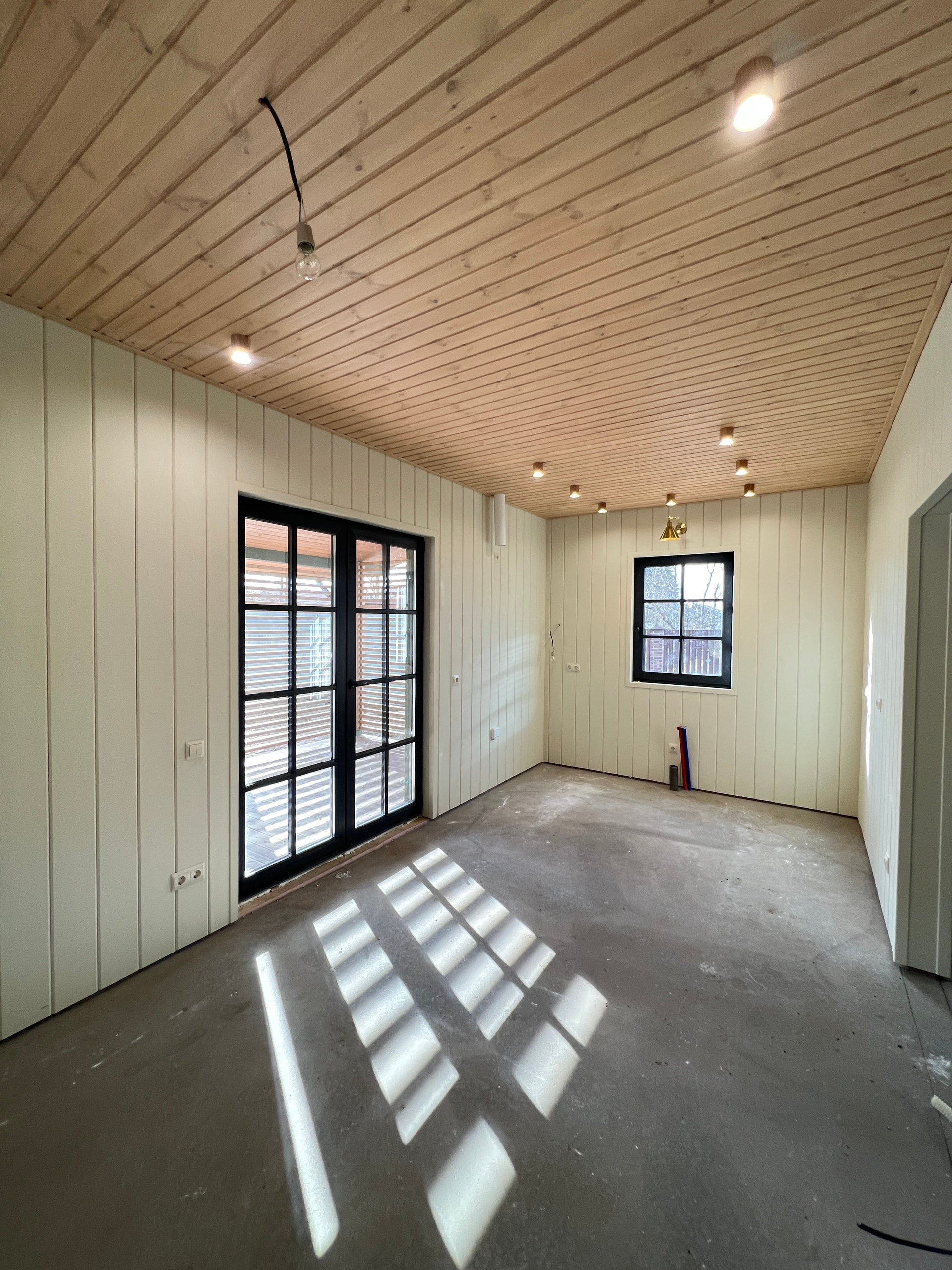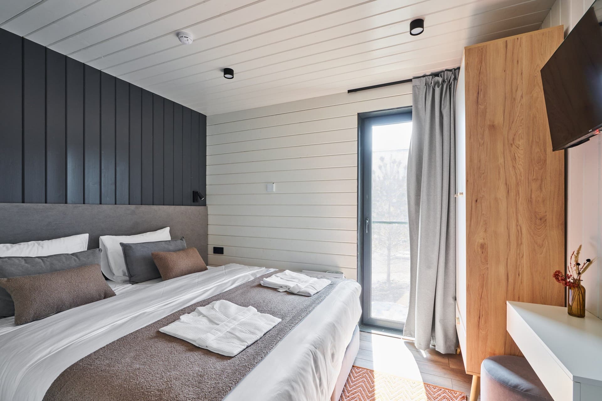 Вертикальная и горизонтальная отделка в один цвет - выглядит спокойно и гармонично.